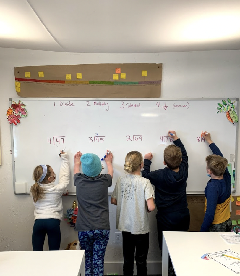 We begin mornings outside, waking up our brains and connecting with our classmates. At Morning Meeting, we engage in a socratic discussion - sometimes these are inspired by our current learnings or are centered around personal/social development topics such as building integrity or how to solve interpersonal problems. We then move on to ‘Core Skills’ time, a series of short work periods and brain breaks that allow students to focus on individualized math, reading and writing goals. Small groups are used to deliver targeted instruction and are based on ability rather than age.